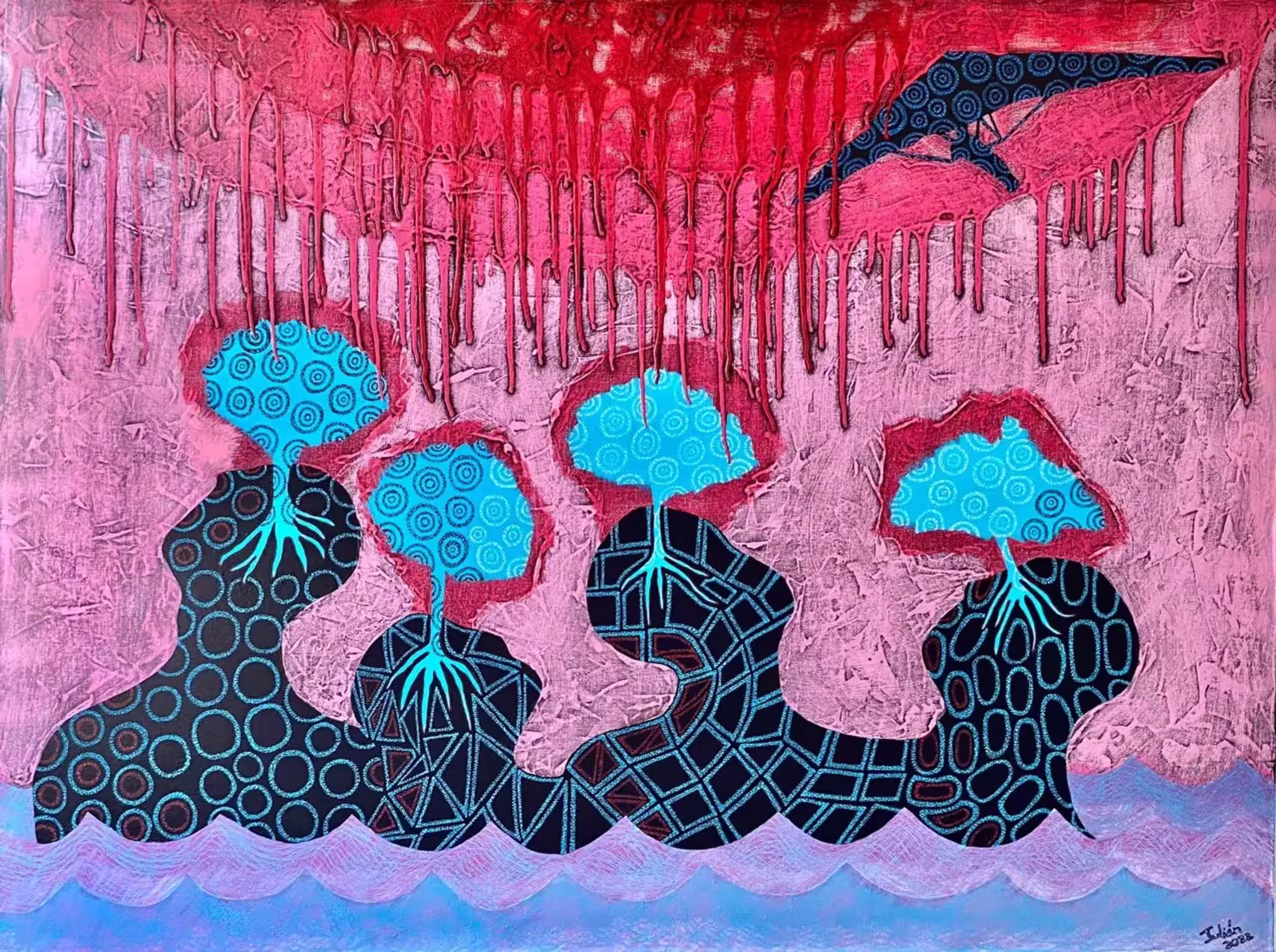 During his student years, Julien was able to meet people from various generations. He uses a variety of techniques such as oil paints, acrylics, and pastel pens. Influences in his work include modern painting, Cuban cinema poster artist, African art, expressionism, and surrealism.